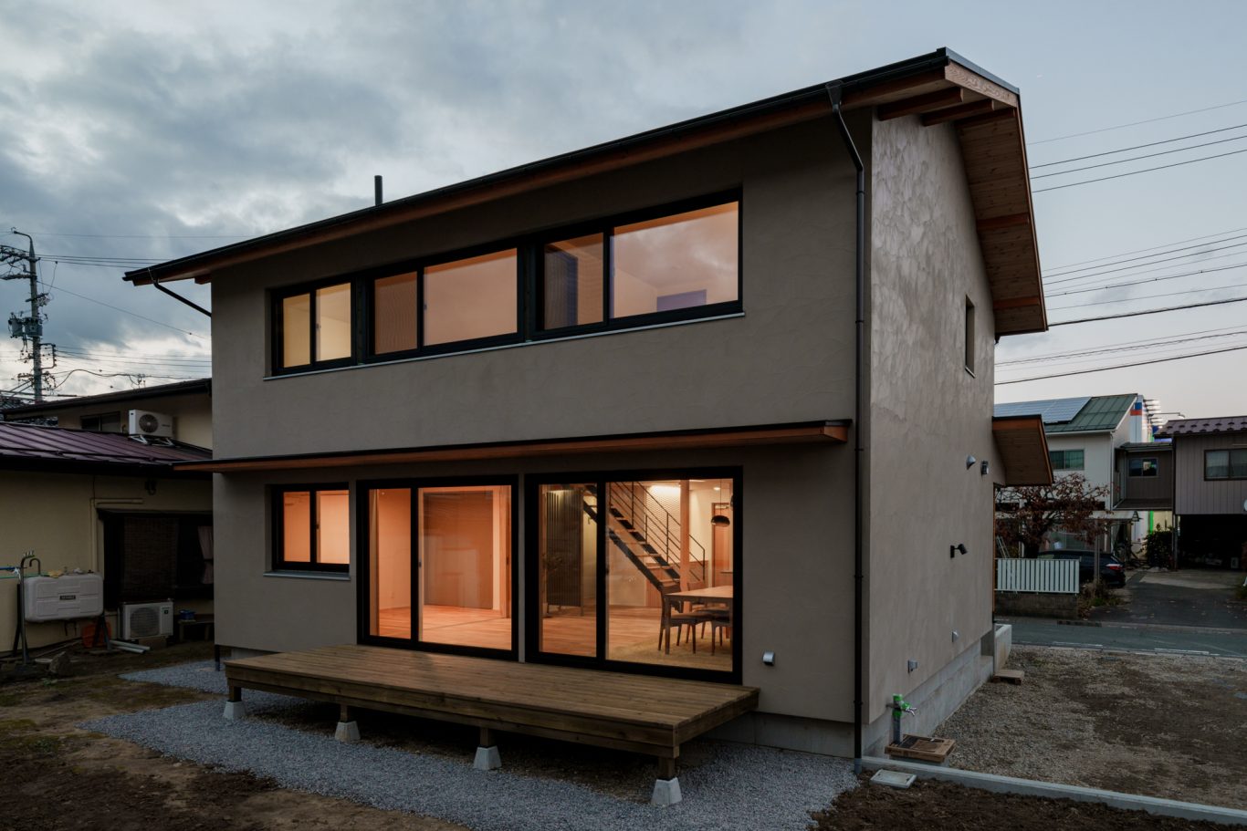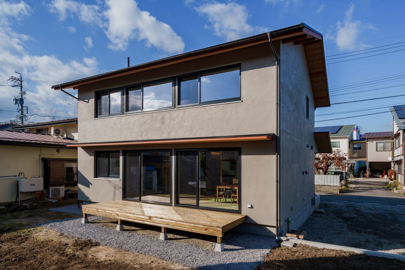 外観はグレージュのスイス漆喰をベースにブラックの樹脂サッシ、木の色が映える落ち着いていてカッコイイ総二階。